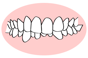 一般的に「出っ歯」と言われる症例。下顎が小さすぎたり、上顎が大きくずれることで起こる場合もあります。前歯だけではなく、その他の歯を圧迫し負荷がかかるため歯周病につながるおそれがあります。 |